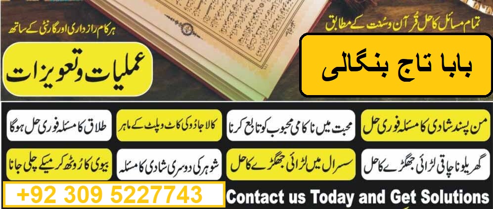 Baba Taj Bangali offers trusted online spiritual services like Online Istikhara, Rohani Ilaj, Bandish ka Tor, Taweezat Amliyat, and Black Magic Removal. Struggling with marriage or business issues? Contact us for expert solutions and personalized guidance. Your satisfaction is our priority!